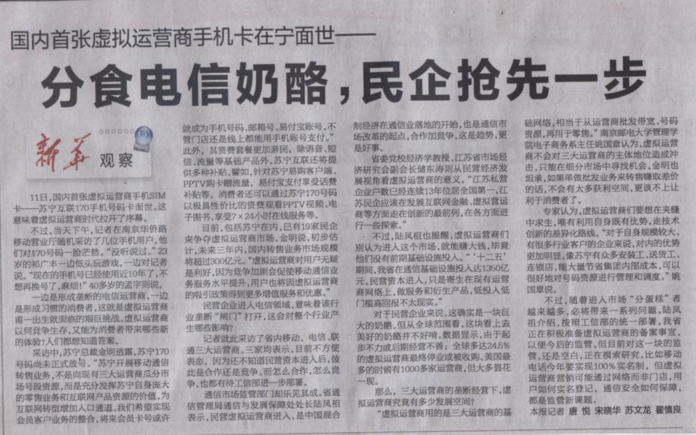【新華日報】分食電信奶酪,民企搶先一步