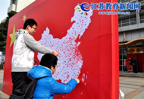 南郵大學生將自己紅色的拇指印填充在白色的中國地圖上,寓意中國的年輕人不忘國恥,捍衛祖國領土完整。