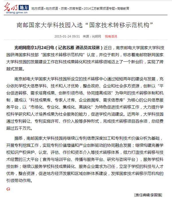【光明網】南郵國家大學科技園入選“國家技術轉移示范機構
