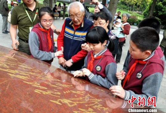 老紅軍與小學生在紅軍廣場朗讀毛澤東的詩詞《七律·長征》