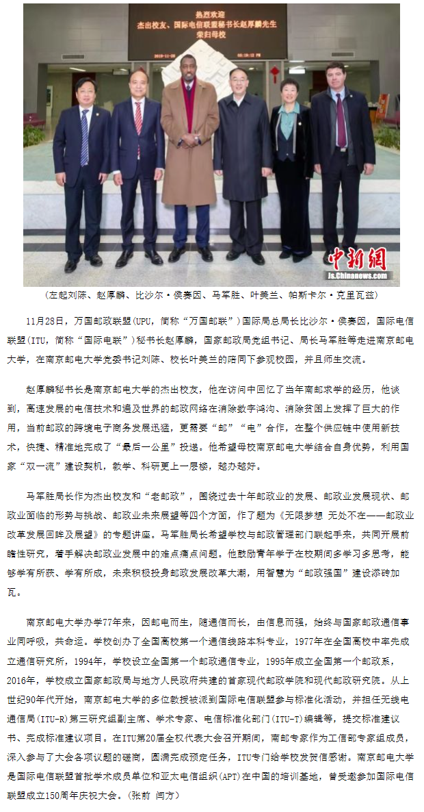 【中國新聞網(wǎng)】萬國郵聯(lián)、國際電聯(lián)、國家郵政局領(lǐng)導(dǎo)訪問南京郵電大學(xué)