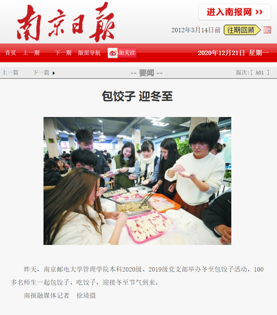 【南京日報】頭版:包餃子 迎冬至(圖片新聞)
