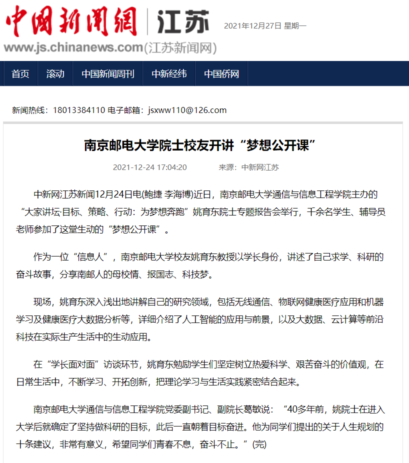 【中國新聞網】南京郵電大學院士校友開講“夢想公開課”
