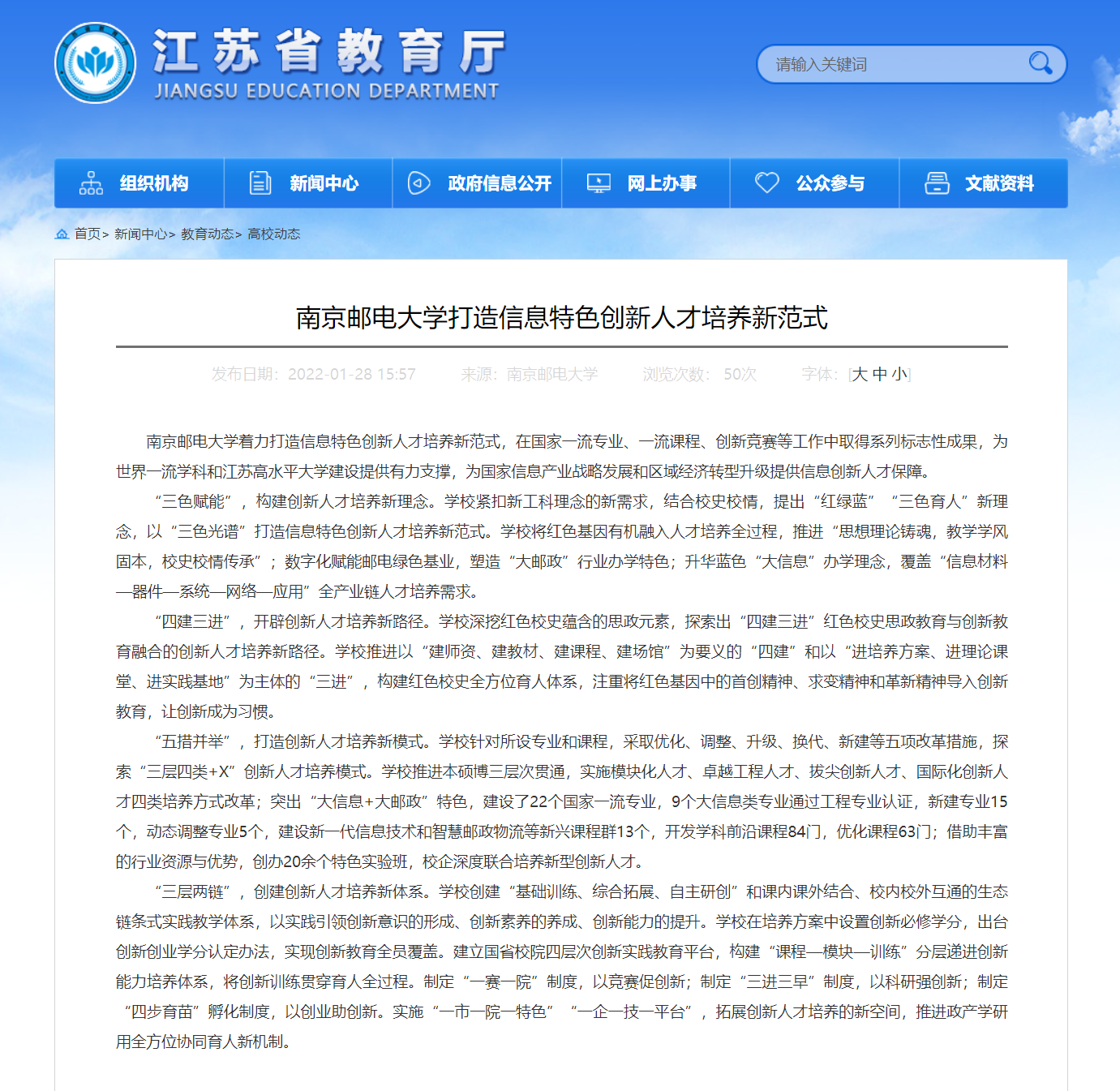 【省教育廳官網(wǎng)】南京郵電大學(xué)打造信息特色創(chuàng)新人才培養(yǎng)新范式