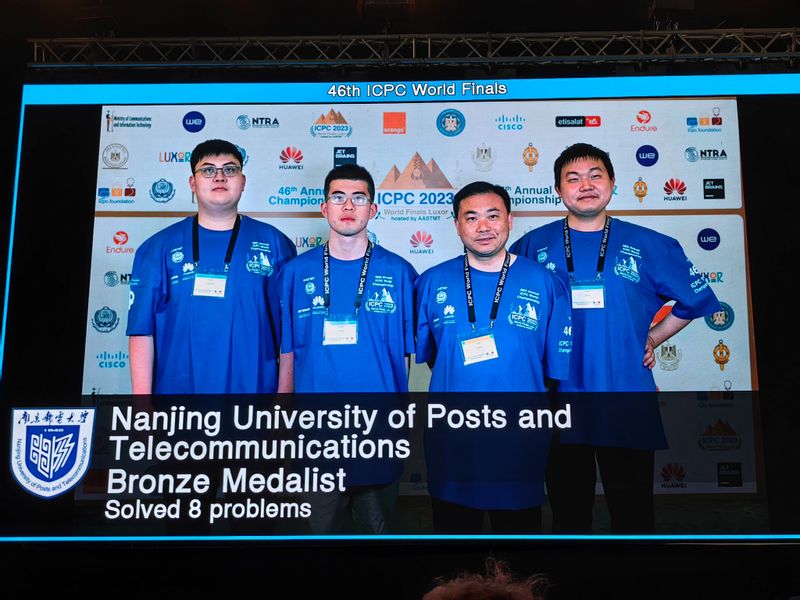 4月14至19日,第46屆ICPC國(guó)際大學(xué)生程序設(shè)計(jì)競(jìng)賽世界總決賽在埃及盧克索舉行。由陳志教授擔(dān)任教練,2020級(jí)本科生何樂(lè)晗、陳以信和趙一舟作為隊(duì)員組成的南京郵電大學(xué)代表隊(duì)參加了第46屆ICPC世界總決賽,取得突破性成績(jī),位列第11名、榮獲銅牌。