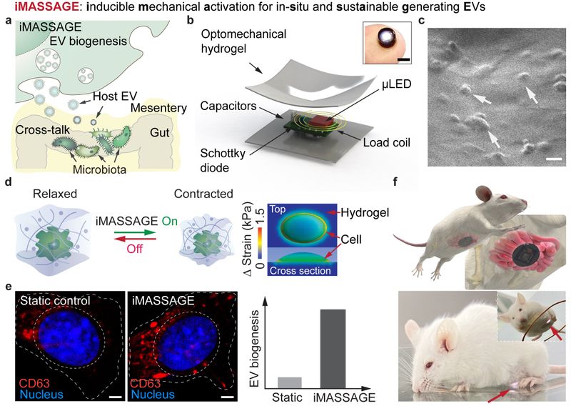 針對以上難題,團(tuán)隊(duì)從細(xì)胞生物信息學(xué)角度出發(fā),發(fā)展了一種無線生物電子學(xué)技術(shù),通過給予細(xì)胞力學(xué)信號刺激,控制目的細(xì)胞大量生產(chǎn)外泌體(稱之為細(xì)胞按摩技術(shù)-iMASSAGE)。該技術(shù)的特點(diǎn)與優(yōu)勢是:與目前常規(guī)的通過擴(kuò)大細(xì)胞培養(yǎng)量來實(shí)現(xiàn)外泌體獲取量提升的方法相比,iMASSAGE技術(shù)無需通過增加細(xì)胞量,而是通過提升每個(gè)細(xì)胞的生產(chǎn)效率,來實(shí)現(xiàn)外泌體產(chǎn)量的提升;該技術(shù)使用無線生物電子器件,能夠遠(yuǎn)程控制器件內(nèi)的細(xì)胞生產(chǎn)外泌體,因此,可以進(jìn)一步植入體內(nèi)病變區(qū),通過電子設(shè)備按需控制體內(nèi)外泌體生產(chǎn),滿足潛在個(gè)體治療的需求;基于體內(nèi)病變區(qū)原位生產(chǎn)和釋放治療性外泌體的技術(shù),可以避免常規(guī)靜脈或系統(tǒng)給藥導(dǎo)致的體液循環(huán)消耗和脫靶效應(yīng),增強(qiáng)局部有效治療濃度;通過特定細(xì)胞的在體原位外泌體可控生產(chǎn),該技術(shù)有可能為探索體內(nèi)細(xì)胞與細(xì)胞、細(xì)胞與腸菌、腫瘤菌群間的跨物種生物信息交流提供工具。