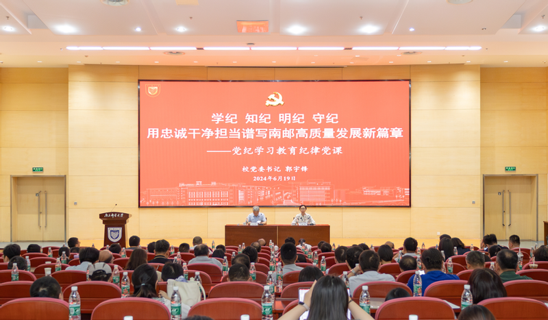 根據(jù)學校黨紀學習教育工作部署,6月19日下午,校黨委書記郭宇鋒在仙林校區(qū)圖書館報告廳,以《學紀 知紀 明紀 守紀 用忠誠干凈擔當譜寫南郵高質量發(fā)展新篇章》為題講授黨紀學習教育紀律黨課。校黨政領導班子成員、全體中層干部、黨支部書記和師生黨員代表參加黨課學習。校黨委常委、副校長、黨委組織部部長謝平主持紀律黨課。
