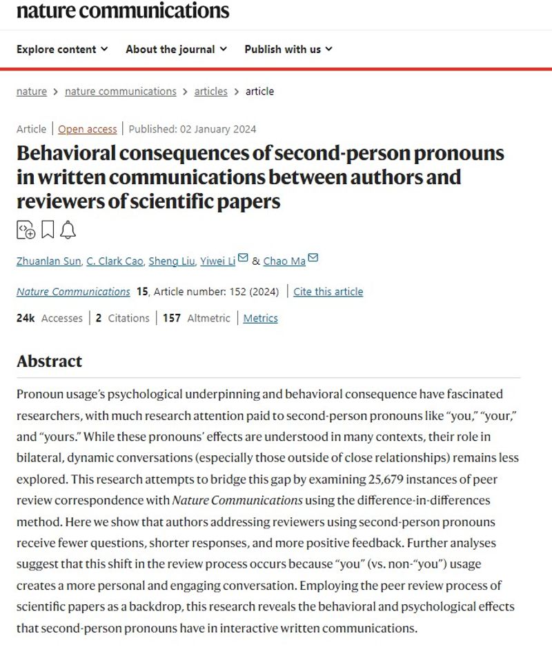 近日,南京郵電大學高質量發展評價研究院教師孫轉蘭以第一作者身份在國際頂級期刊Nature Communications上發表學術論文“Behavioral consequences of second-person pronouns in written communications between authors and reviewers of scientific papers”。