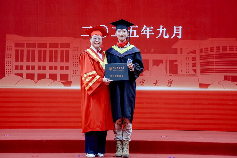 今年六月,學(xué)校舉辦2025屆學(xué)生畢業(yè)典禮,李萬(wàn)蕓因參加九三閱兵,未能參加畢業(yè)典禮。現(xiàn)場(chǎng),葉美蘭為李萬(wàn)蕓授予學(xué)士學(xué)位。