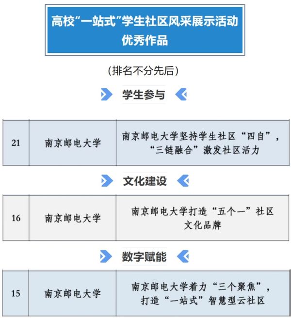 近日,2025年高校“一站式”學(xué)生社區(qū)風(fēng)采展示活動(dòng)評選結(jié)果公布,南京郵電大學(xué)推薦報(bào)送的3項(xiàng)成果獲評優(yōu)秀作品。