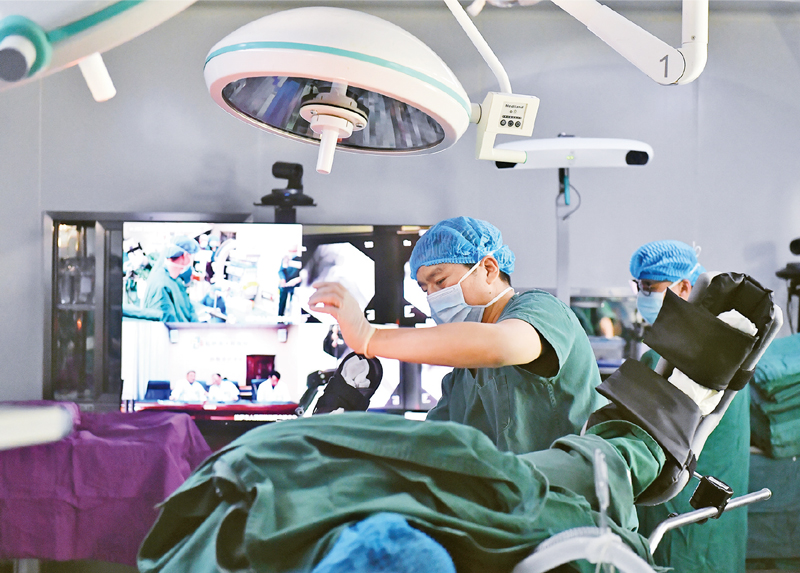 數字技術與醫療、農業、能源、建筑、服務業等緊密結合,正在推動傳統產業日益高端化、智能化。圖為2021年4月19日,拉薩市人民醫院骨科醫生在北京積水潭醫院專家遠程指導下,使用骨科機器人開展骨科手術。新華社記者 孫瑞博 /攝