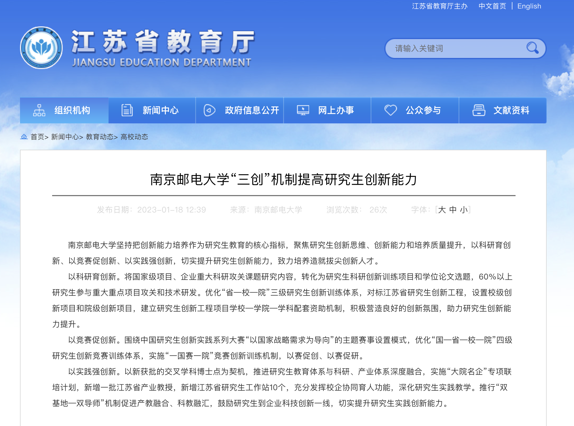 | 【省教育廳官網(wǎng)】南京郵電大學(xué)“三創(chuàng)”機制提高研究生創(chuàng)新能力 |