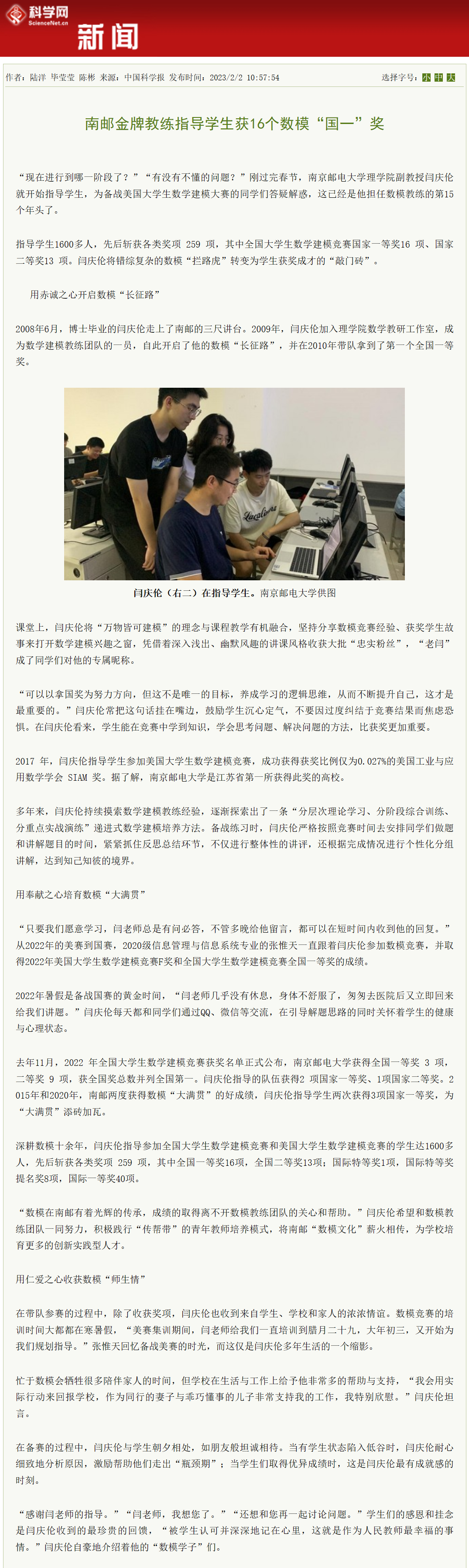 | 【科學網】南郵金牌教練指導學生獲16個數模“國一”獎 |