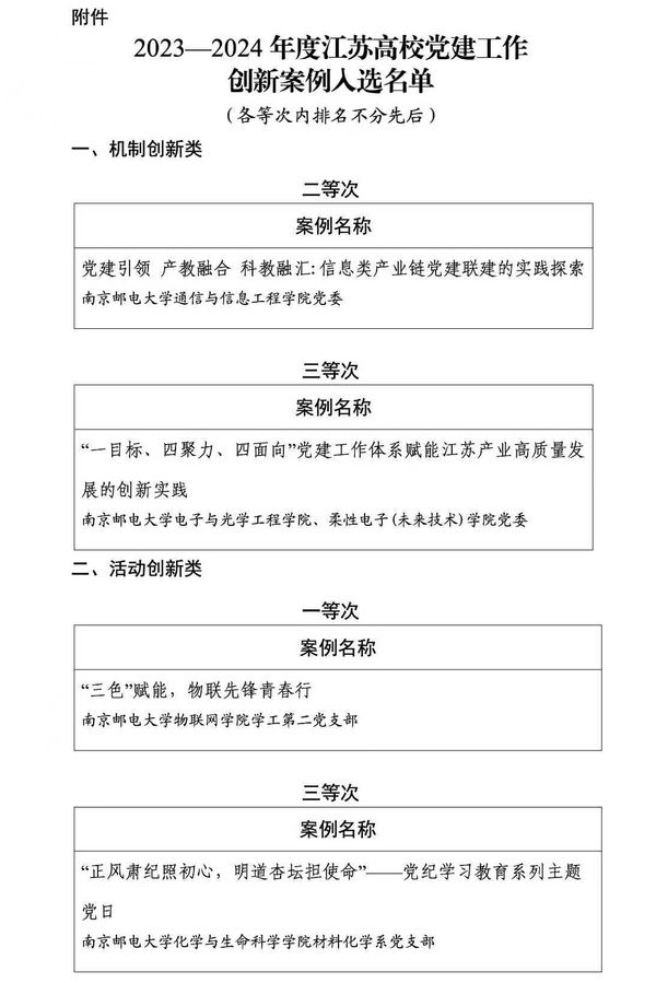近日,江蘇省委教育工委公布2023—2024年度江蘇高校黨建工作創新案例名單,南京郵電大學推薦報送的4項案例全部入選,獲一等次1項、二等次1項、三等次2項。其中,通信與信息工程學院黨委《黨建引領 產教融合 科教融匯:信息類產業鏈黨建聯建的實踐探索》獲機制創新類二等次,電子與光學工程學院、柔性電子(未來技術)學院黨委《“一目標、四聚力、四面向”黨建工作體系賦能江蘇產業高質量發展的創新實踐》獲機制創新類三等次;物聯網學院學工第二黨支部《“三色”賦能,物聯先鋒青春行》獲活動創新類一等次,化學與生命科學學院材料化學系黨支部《“正風肅紀照初心,明道杏壇擔使命”——黨紀學習教育系列主題黨日》獲活動創新類三等次。