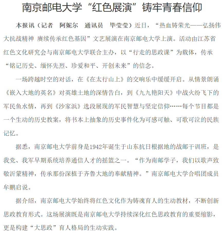 【江蘇教育報】南京郵電大學“紅色展演”鑄牢青春信仰