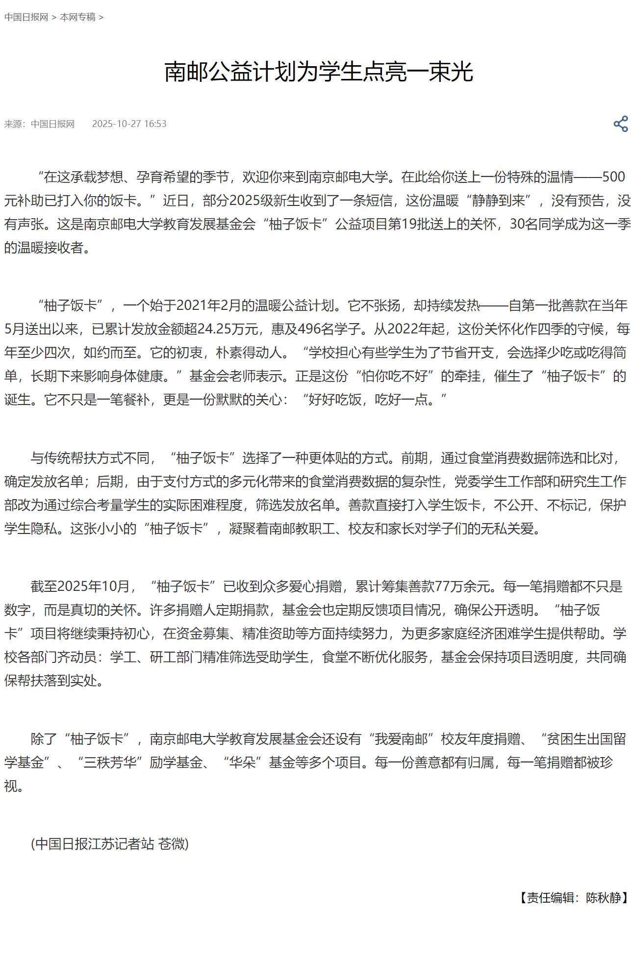 | 【中國日報網(wǎng)】南郵公益計劃為學生點亮一束光 |