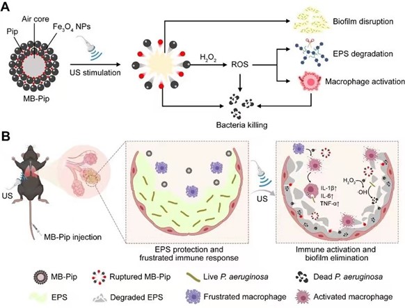 The team constructed ultrasonic response drug-loaded catalytic microbubbles (MB-Pip) composed of Fe3O4 nanoparticles (Fe3O4 NPs) and piperacillin (Pip) for the removal of Pseudomonas aeruginosa biofilm. Under the action of ultrasound, MB-Pip generates inertial cavitation, which disrupts the biofilm structure through mechanical effect. The released Fe3O4 NPs can catalyze the degradation of extracellular matrix, realize the physical/chemical dual-mode biofilm destruction, and effectively enhance the drug penetration and antibacterial performance. In addition, Fe3O4 NPs can activate macrophages to polarize to M1 phenotype, enhance the bactericidal ability of macrophages, and achieve efficient treatment of chronic lung infection caused by Pseudomonas aeruginosa in mice, which provides a new research idea for solving the problem of clinical bacterial biofilm infection.