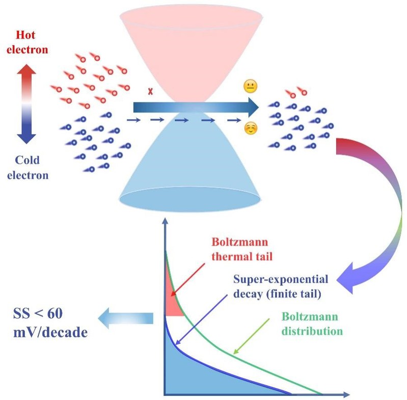 The cold electron injection mechanism of CS-FETs with a cold source.Cold source FET devices with filtering function can cut off the Boltzmann thermal tail energy distribution by filtering out high-energy electrons, thus reducing the subthreshold swing and realizing low power devices.