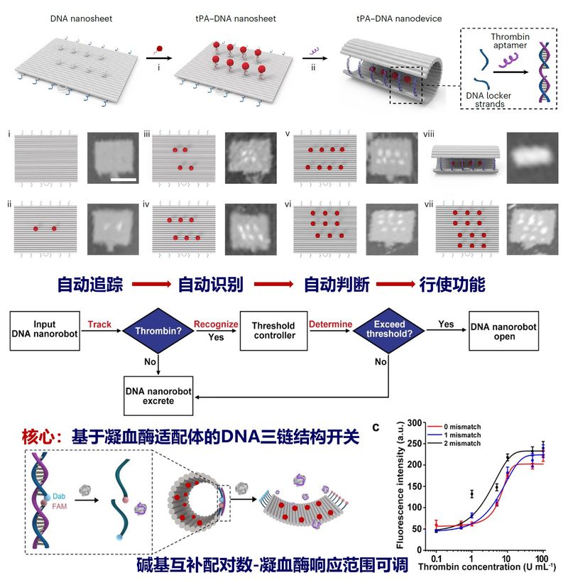 The team's researchers first constructed 90 x 60 nm rectangular nanosheets based on DNA origami technology and achieved precise and controllable spatial and quantitative loading of the thrombolytic drug tPA molecule on its surface. Subsequently, utilizing the DNA triple-stranded structure, logically operable DNA nanolocks were designed to curl the rectangular nanosheets shut to form nanotubes to protect the drug activity. The DNA nanolock containing thrombin aptamer is the computational core of the thrombolytic nanodevice, which automatically performs a series of tasks of tracking recognition, logic operation and response opening against thrombin in a set sequence. In response to the difference in thrombin concentration between thrombus and wound clot, the DNA thrombolysis nanodevice equipped with a specific thrombin concentration threshold controller realizes the logic operation for thrombin concentration for the first time in animals. It can accurately distinguish between normal fibrin clot and thrombus, significantly reduce the coagulation abnormality caused by thrombolytic drugs, and realize intelligent and precise drug delivery, which has been verified in animal models of stroke, pulmonary embolism, carotid artery and leg vein thrombosis.
