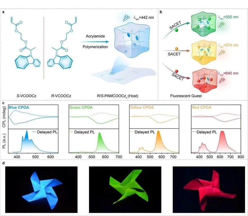 Recently, Prof. Tao Ye and Prof. Chen Runfeng from Academician Huang Wei's team at the State Key Laboratory of Organic Electronics and Information Display, Nanjing University of Posts and Telecommunications (NJUPT), have made new progress in the field of chiral organic long afterglow. A simple method to obtain blue chiral long afterglow by covalent self-limiting domain chiral chromophores is proposed, and blue chiral organic long afterglow polymers with ultra-long lifetime and high luminescence asymmetry factor are designed. The team blended the blue chiral long afterglow polymer as the main body with the fluorescent guest, and utilized the synergistic energy transfer strategy of afterglow and chirality to successfully realize the construction of a full-color chiral long afterglow emission system, and explored the application of this kind of material in the fields of information encryption and three-dimensional display.