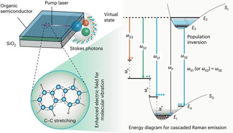 Organic semiconductors, with their unique molecular structures and optoelectronic properties, are regarded as core materials for next-generation flexible electronics, widely applied in flexible displays, photovoltaics, and other fields. However, their nonlinear optical effects typically require extremely high-energy excitation, leading to material damage under intense light, which has long limited their application in nonlinear optics. Raman scattering, a nonlinear optical technique based on molecular vibrations that generates optical gain, holds significant potential in explosives detection, bioimaging, and optical communications due to its characteristic molecular vibrational signals and spectral tunability. Traditional Raman lasing relies on high-energy pump sources to overcome molecular vibrational losses, resulting in bulky and costly setups. Achieving “low-threshold, high-gain” Raman lasing has remained a global scientific challenge.